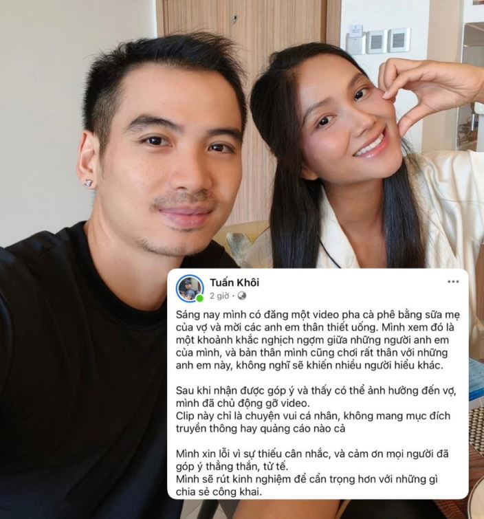 Tối 1/11, sau khi vấp phải làn sóng chỉ trích từ cư dân mạng vì đăng tải đoạn clip dùng sữa mẹ trữ trong tủ lạnh của vợ để pha cà phê mời bạn bè, chồng của H’Hen Niê – nhiếp ảnh gia Tuấn Khôi – đã chính thức lên tiếng xin lỗi.