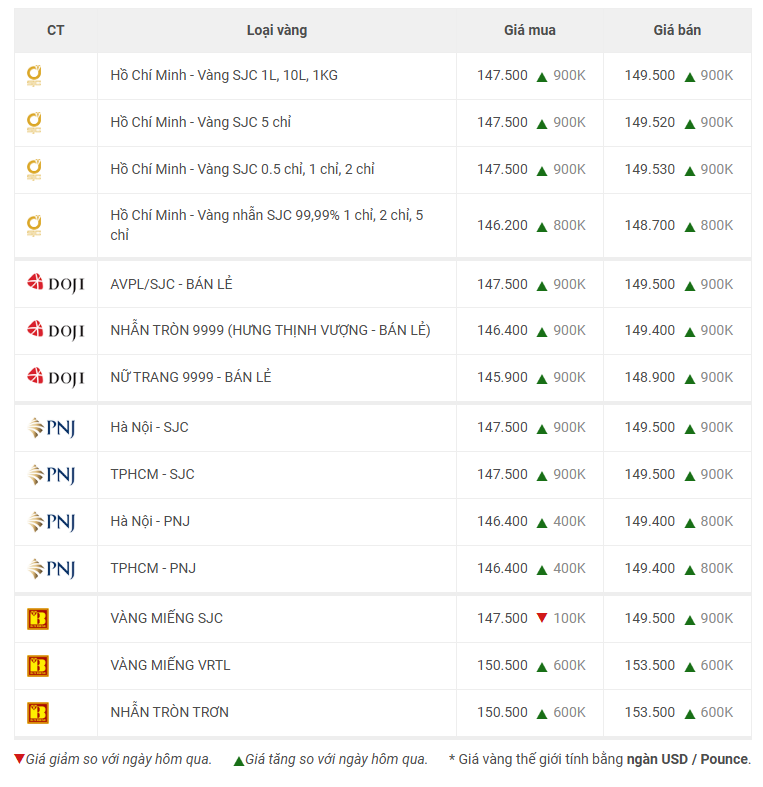 Tại PNJ, vàng SJC tại Hà Nội và TP.HCM đều được niêm yết 147,5 – 149,5 triệu đồng/lượng, tăng 900.000 đồng/lượng ở cả hai chiều.