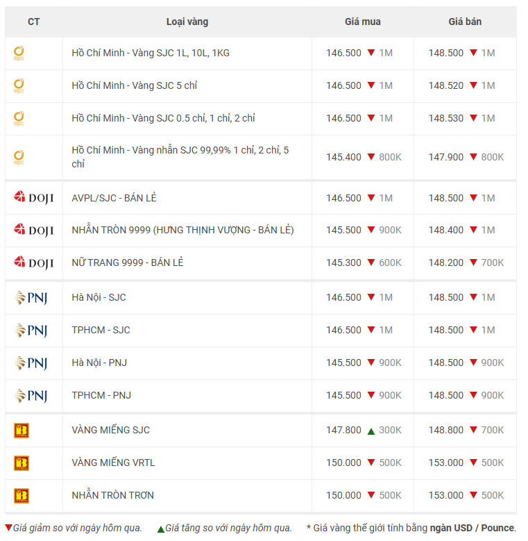• SJC Hồ Chí Minh: 146,5 – 148,5 triệu đồng/lượng (giảm 1 triệu đồng/lượng).