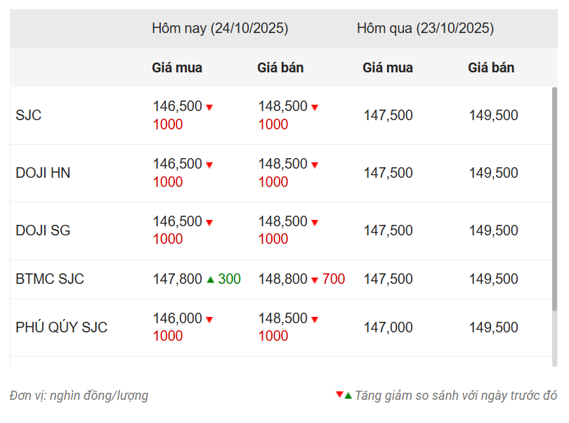 • DOJI AVPL: 146,5 – 148,5 triệu đồng/lượng (giảm 1 triệu đồng/lượng).